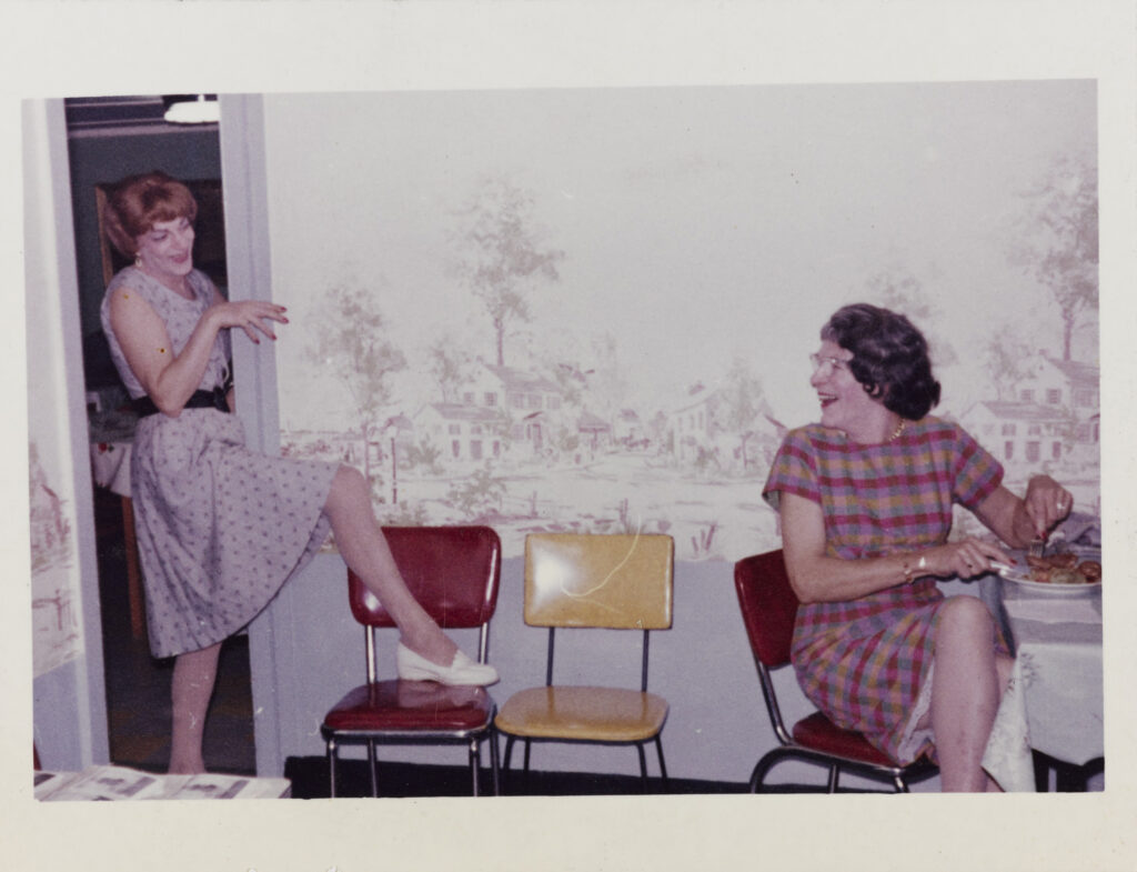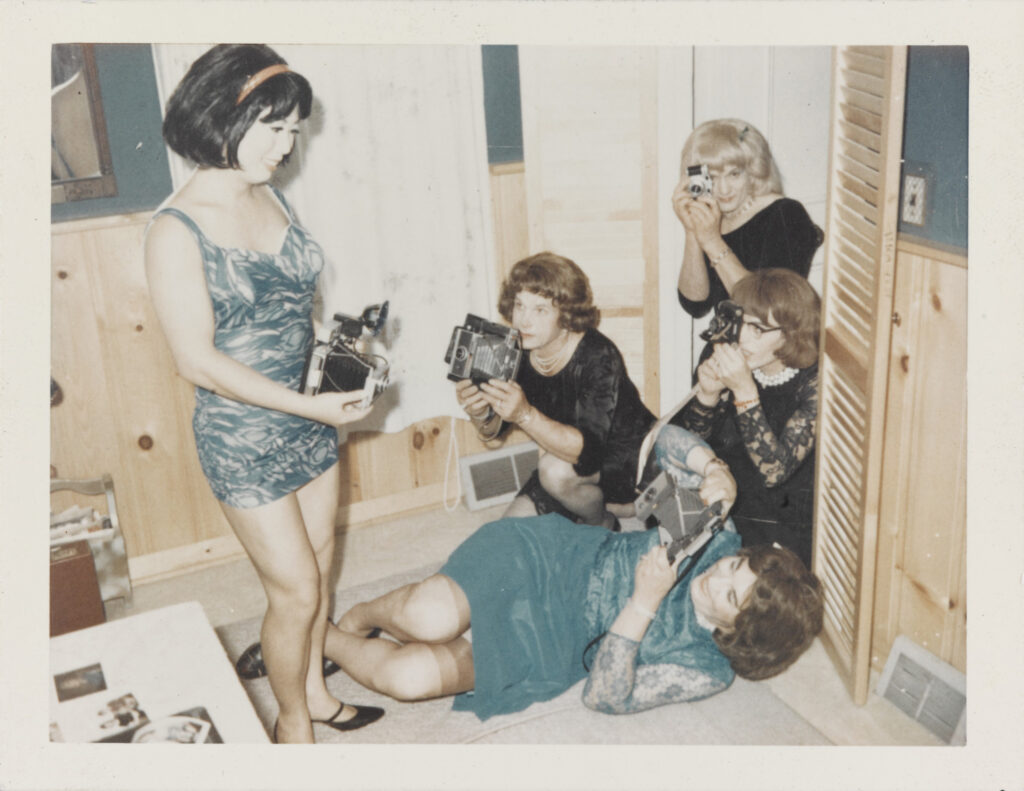 In a photograph from the mid-1960s, identified as a “photo shoot with Lili, Wilma, and friends, Casa Susanna, Hunter, NY,” three women spill out from what appears to be the wooden slats of a closet door. The walls are clad in period-perfect knotty-wood paneling. The women, too, look fabulously of the moment, all kicky little mod dresses and gently curling bobs and headbands and horn-rimmed glasses and pearls. A fourth woman reclines, and yet another stands, filling the tiny room. All are holding cameras pointed at one another. In the corner, a blond with a wicked gleam in her eye trains her pocket-size camera on the person taking the picture. But she’s also winking at her future viewer, whom, one might imagine, every person in this photograph assumed would be someone like them: someone the world saw as a man but who found pleasure in seeing themselves as a woman. Which makes this photo not only joyous but dangerous. Because in appearing as women, each of them, in that moment, was committing a crime. And having the time of their life.