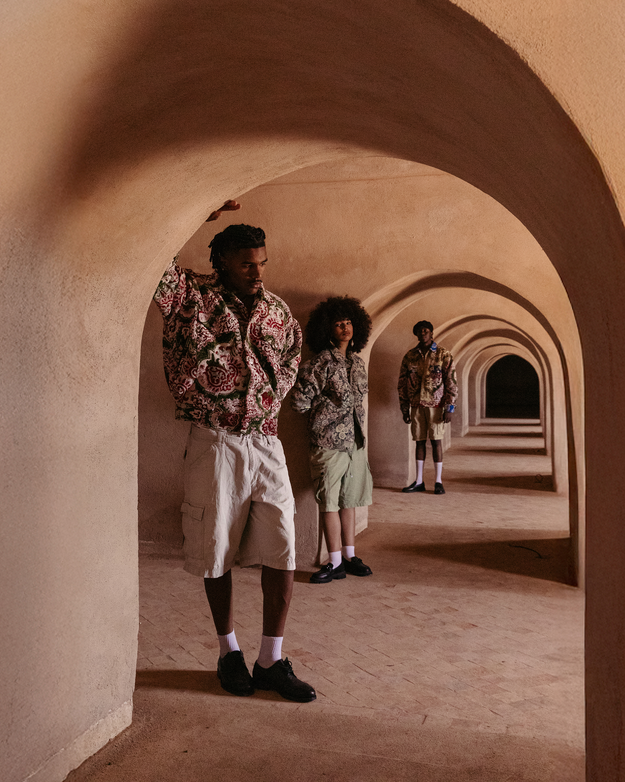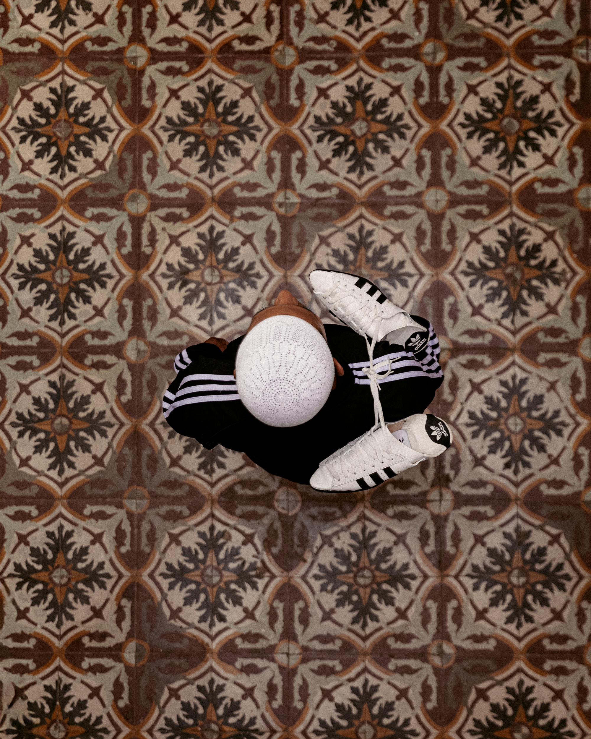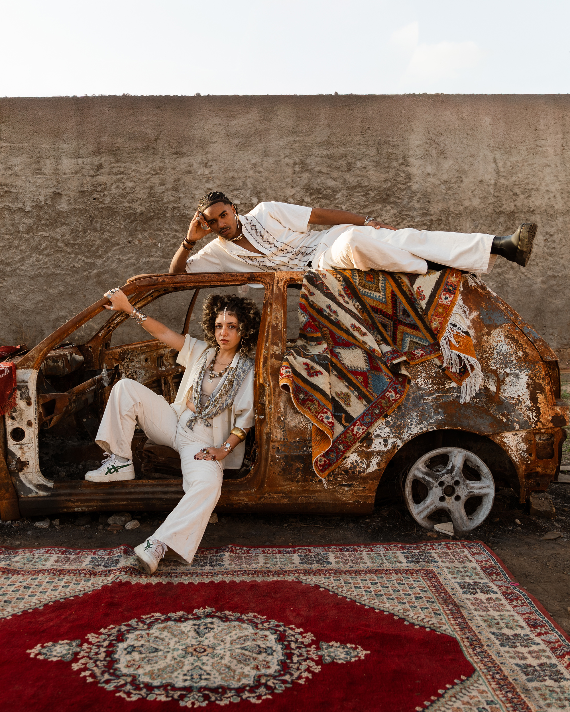 In the project Re-Connected, part of her series Marroki Export (2024-ongoing) depicting different swaths of Moroccan youth, El Bahja photographed two models—styled as imaginary siblings—who live outside Morocco but are deeply connected to the country. They are dressed in upcycled Adidas outfits and pose against the Old Medina of Rabat, a UNESCO World Heritage Site. The photographs from Re-Connected were also partly shot in a traditional house to represent a “grandparents’ home,” as El Bahja’s puts it, and the importance of elders as permanent symbols of belonging, despite histories of migration or alienation.