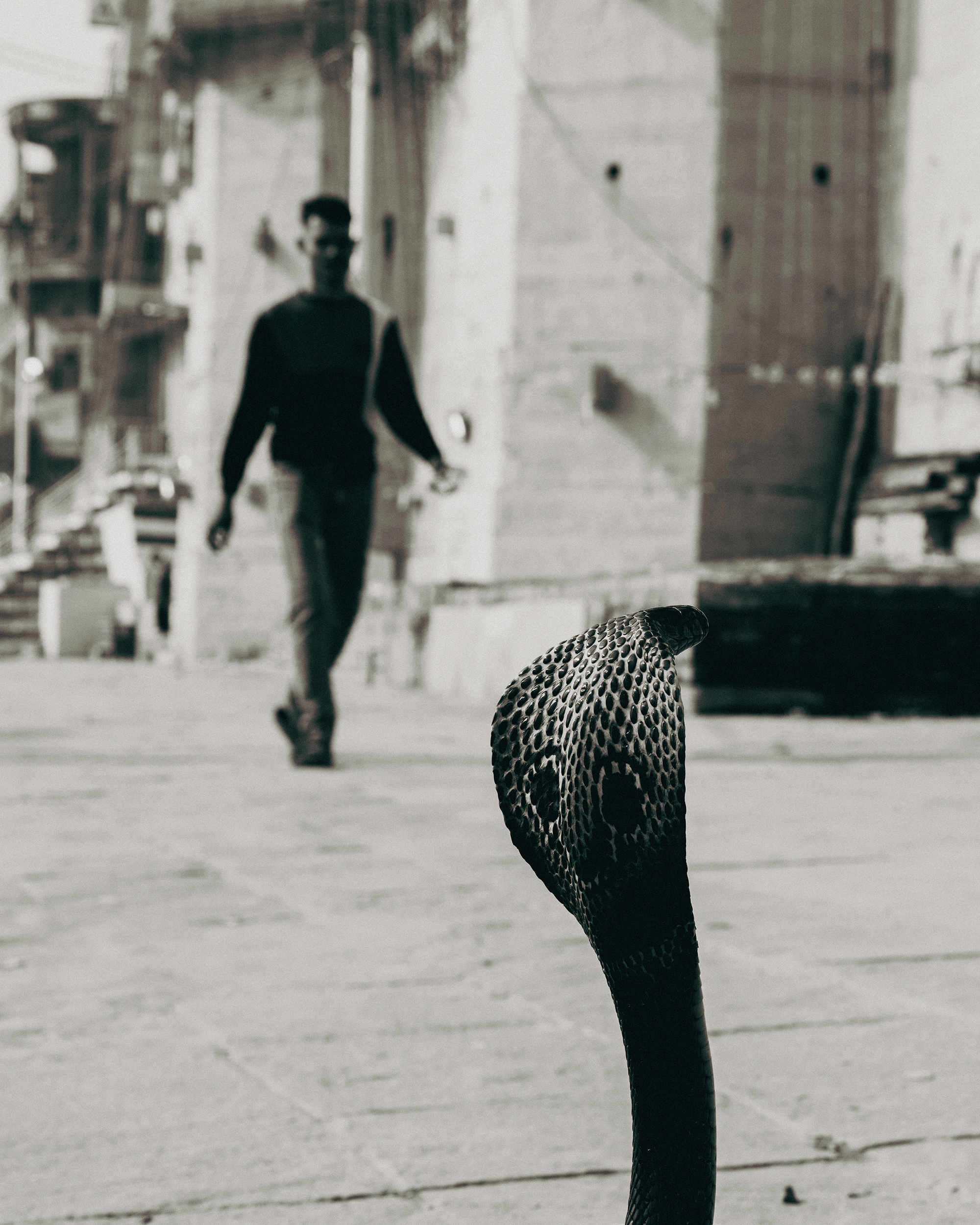 Soon, however, these self-imposed constraints began to look like opportunities. Might deeper truths be found within the tropes that cast India as a mystical land of stark contrasts? Namaste or Whatever began with Sinha’s decision to revisit his abandoned pictures and endeavor to “do a complete one-eighty, and just focus on the clichés.” Indeed, the series gives you much of what you’d expect: A snake charmer’s cobra rears its head into the frame; men immolate a corpse on the banks of the Ganges; handprints in white paint left by pilgrims pile up on a ruddy temple wall. What distinguishes these pictures from the many like them is the sheer lushness of Sinha’s seeing.